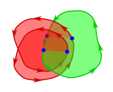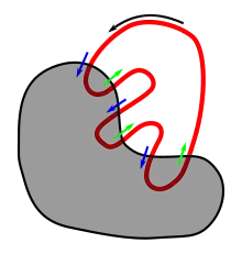![]() A 3D image showing the intersection of a simple path (red curve) with a simple surface (green surface with the counter-clockwise boundary highlighted). The positive intersection points are denoted by red "+" signs, and the negative intersection points are denoted by blue "-" signs. |