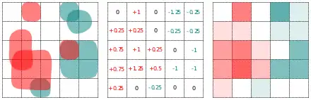 In the image below, the multi-point in the left panel is converted to the scalar field in the center panel by averaging the point weight over each cell. The volume of each cell should be infinitesimal. The multi-point in the right panel corresponds to the same scalar field, and is in a more canonical form where oppositely weighted points have cancelled out.