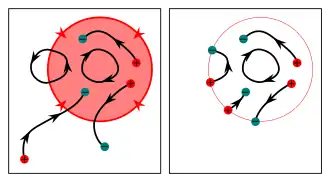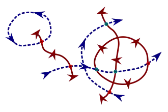 ![]() A 2D image showing the intersection of a multi-path (dark blue dashed curves) with a multi-surface (dark red solid curves). Positive intersection points (red circles) occur when a path intersects a surface in the preferred direction. Negative intersection points (teal circles) occur when a path intersects a surface in the opposite direction. The intersection is effectively a multi-point. |