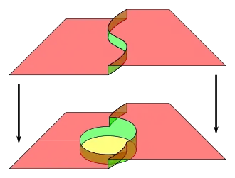 Consider a surface with weight from , and a volume with weight from . Let denote the counter-clockwise boundary of , and let denote the inwards oriented surface of . There are two sources for the counter-clockwise boundary of . Any time intersects , the intersection contributes to the boundary of . When leaves , the boundary of cannot follow, and instead must trace along the surface of while remaining in the surface as indicated in the image to the right. The boundary of the total intersection , denoted by , consists of two parts: the intersection of the boundary of with , denoted by , and the intersection of the inwards-oriented surface of with , denoted by . Therefore: .