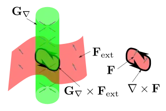![]() The intersection between a multi-path shown as a blue tube with a multi-surface shown as layers of red sheets. Vector F is the flow density through the blue tube. Vector G is the surface density in the red sheets. The green parallelogram is a 2D projection of the volume of the intersection. The intersection points become more dilute as the angle theta increases, so the intersection point density is the dot product of F and G. |