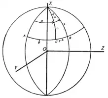 Suppose that is the north pole of the sphere, the angular distance measured from along the arc of a great circle, and the angle which the plane of this great circle makes with the plane of a great circle through the point .
