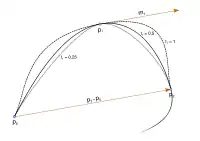 The curve starts (for ) at in direction of and then changes course to direction and reaches for . As the figure illustrates, two Hermite curves can be smoothly attached to each other by choosing the same tangent vector for the corresponding end points.