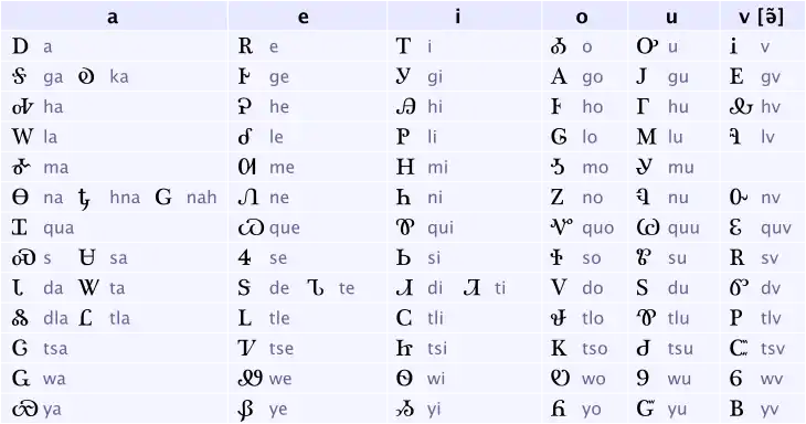 The Cherokee language does not use a alphabet, but a syllabary. That means each Cherokee symbol represents a syllable, not just a consonant or a vowel. Because of this, Cherokee symbols are arranged in a chart, with a column for each Cherokee vowel and a row for each Cherokee consonant.