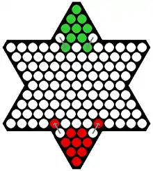 The board is the shape of a six point star, with holes for possible moves of the pieces, typically marbles or pegs. The center of the board forms a hexagon with five holes along each side. Each point forms a triangle with ten (10) holes in four rows; 1 + 2 + 3 + 4 = 10. The points are typically different colors, corresponding to the colors of the pieces.