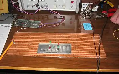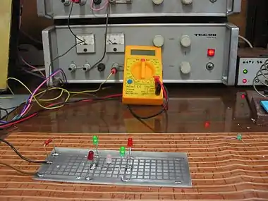 This was a true hands-on exercise where we mounted the real circuit on a real prototyping PCB; we soldered the two rectifying LEDs and the LED load on the board and connected them by wires. Thus we finally got a real full-wave bridge rectifier that didn't need any measuring devices. Imagine it should indicate its state (the current direction) by the very diodes! We were eager to get to know, if it would work really as we had assumed? It would be very interesting to test it. PavlinPanev 64