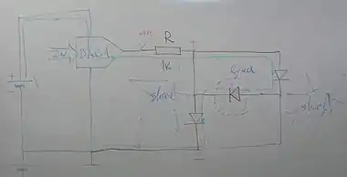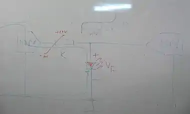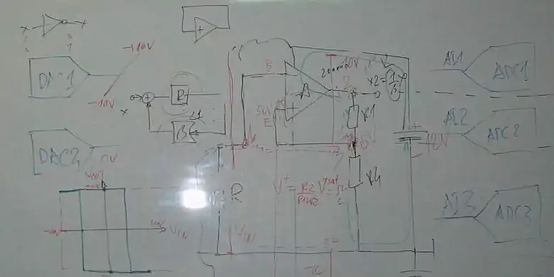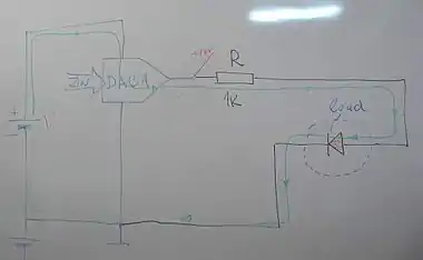 Step 1. We started building the circuit on the whiteboard by connecting the load (the tested red LED). Here we assumed that DAC 1 was producing a positive voltage from 0 up to 10 V (this was the positive half-wave). Note how we have outlined the inverse S shape of the "positive" part of the future bridge. PavlinPanev 64