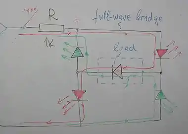 We had already known that diodes can act as decoupling elements (switches); so, we put two red-colored LEDs in the two opposite "positive" bridge legs acting as rectifying and visualizing diodes for the positive half-wave. We expected that since all the three diodes (including the "load") were connected in the same direction they would enable the current to flow in the right direction and would shine during the positive half-wave.