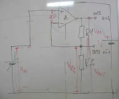 Similarly, what happens, if we make a mistake when build a non-inverting amplifier swapping the inverting and non-inverting inputs? Let's try.