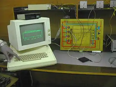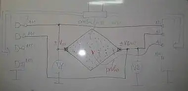 A wire itself, unlike resistors, has a length; that's why Ohm, the great scientist in electric circuits, has used it in his experiments. You can touch a wire to feel how it reacts on bigger current. In this particular exercise we have conducted experiments by investigating the voltage distribution along conductive foam as shown on the picture. As you can see, we have connected wires to two of the foam edges and put voltages from DAC1 and DAC2. We have made a lot of measurements with the 'probe' to investigate the voltage distribution along the conductive foam.