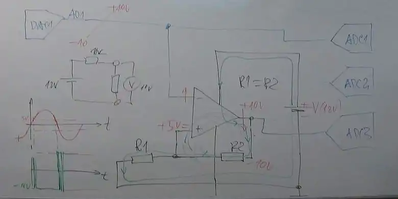 Step 2. Then we assumed that DAC 1 was producing a negative voltage from 0 up to -10 V (this was the negative half-wave) and connected the true S shape of the rest "negative" part of the future bridge. Only, a short-circuit turned out:( What should we do then? We began thinking...