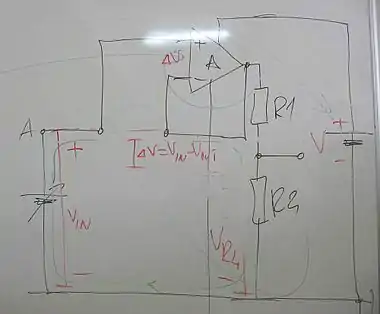 The real load introduces some voltage drop VL, which affects the excitation voltage VIN. Now, not all the input voltage is applied across the current-setting resistor R but only the voltage difference VIN - VL. In other words, here the voltage difference VIN - VL determines the current IOUT instead the voltage VIN. As a result, the current decreases: