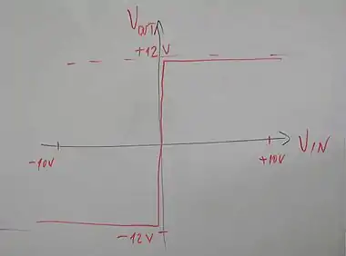 Transfer characteristic. Microlab can help us to obtain this curve on the screen. There is no time in this graphical presentation; there is only input and output quantities. We might discern three regions on this curve: negative saturation (large), active region (narrow) and positive saturation (large).