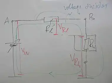 Two resistors can be used to set a specific voltage. For example, if two resistors are connected as shown and a voltage of 10 volts is applied to the ends, then if both resistors are of equal value, the voltage at the middle point connection point will be 5 volts. The voltage is divided between the two resistors.