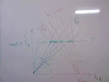 For this purpose, we have to superimpose two characteristics - one of the source and one of the load. First, let's draw the IV characteristic of the voltage source acting here as a power supply. What is it? It is a vertical line that is shifted with the magnitude of the voltage source VCC. Then, we have to show the presence of the load by inclining the line to the left according to the load resistance RL. The resulting curve represents an IV characteristic of a real voltage source having a voltage VCC and an internal resistance RL (they name it "load line"). After, we have to plot the transistor's output characteristic on the same coordinate system. The crossing point is known as an operating point; it represents the present magnitudes of the voltage and the current.