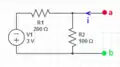 Suppose we are going to connect a DC Voltage power supply to points a and b. The goal is to characterize the insides of the box that contains a DC voltage source and a couple of resistors. Do this by: