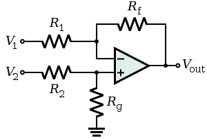 Under the condition that the Rf /R1 = Rg /R2, the output expression becomes:
