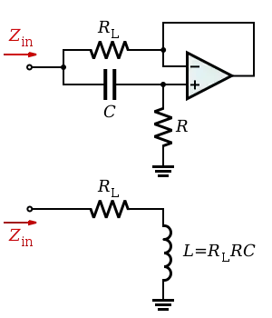 This circuit is unsuitable for applications relying on the input impedance seen left to right and indicated by the red symbol is the same in both circuits. The output on the left could tell the difference between the op amp circuit and an inductor.