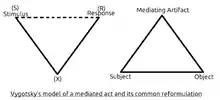 Activity Theory (AT), often referred to as Cultural-Historical Activity Theory (CHAT), is a broad cognitive learning theory that emphasizes complex mediation of action and interactions between individuals (subjects), objects, contexts and communities. It is often considered as a conceptual lens through which to consider a human activity more in-depth, providing “the tools for revealing the social and material resources that are salient in activity.” [1] Activity Theory was developed by revolutionary soviet psychologists Lev Vygotsky, Alexi Leont’ev and others during the 1920’s and 1930’s in response to earlier theories of learning including behaviorism, psychoanalysis and reflexology.[2] Vygotsky’s focus was to draw on his earlier work in cultural-historical theory to determine how culture and language mediate between a stimulus and the response. AT also differs from Piaget’s theories, as it sees cognitive processes as influenced and mediated by external artifacts and influences, rather than considering them as separate.[3] Basically, AT focuses on activities undertaken by subjects (human agents) who are motivated toward some objective (object); their activities are mediated by tools or mediating artifacts (which can include symbol systems and language).[4] This can take the form of a person (subject) using a can-opener (tool) to open a can (object), or of a child (subject) using words (tool) to ask for a cookie (object). Tools / mediating artifacts can be more abstract, including mathematical algorithms or the knowledge of a process, and are considered separately from, but also mediating the subject and its motivations.[1] This relationship has often been portrayed using a triangular diagram; pictured first is Vygotsky’s original theory (stimulus (S), Response (R) and “a complex, mediated act” (X)); the second image presents a more common version; subject, tool/mediating artifact, object. The following example demonstrates this and suggests Leont’ev’s further contributions to follow.