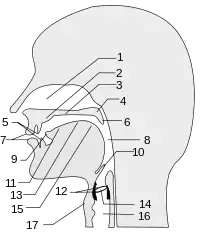 In humans, sound comes from the larynx — the voice box — and passes through the laryngeal cavity, the pharynx, and the oral and/or nasal cavity. Here's a diagram (right) naming parts of the human vocal tract.