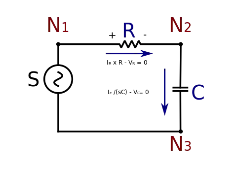 - R is a resistor with the positive terminal at N1 and the negative terminal at N2