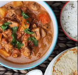 Chicken tikka masala is a dish based on chunks of Indian-style roasted chicken (Chicken Tikka) cooked in a Tomato, Curry sauce, originating in Britain but intentionally recalling Indian dishes. There is no standard recipe for chicken tikka masala; a survey found that of 48 different recipes the only common ingredient was chicken.[1] The sauce usually includes tomato and either cream or coconut cream and various spices.