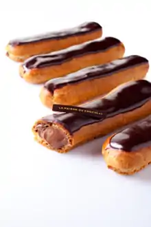 These long, puffy buns are stuffed with cream and topped with rich chocolate icing. The buns are made with choux pastry, which is made by bringing butter and water to the boil, tipping in the flour and then beating in the eggs.