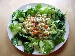 Ensalada Rusa, which translates into "Russian Salad" is a simple potato salad that is a staple in Uruguayan tables. It is served with "asado" in restaurants.