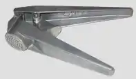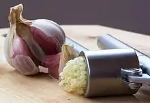 A garlic press is a small kitchen tool designed to simplify the process of crushing a clove of garlic. It is a hinged device. The garlic clove is put into a containing section and when the arms of the press are closed, the clove is crushed and the pulp is forced out through a grating.