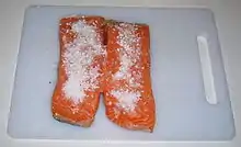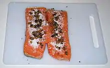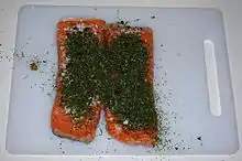 Use the thick part of the salmon filet found towards the head, it should be approximately 2-5 cm (about an inch) thick. Cut the filet into two equally sized parts (if you are making gravlax for many people it is fine to use two filets instead). Don't use the part closest to the tail, since it is not thick enough. Now freeze the salmon for at least four days at -18C or colder to kill any parasites.