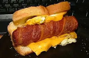 - When oil reaches 355°F, lower wrapped hot dog into fryer.