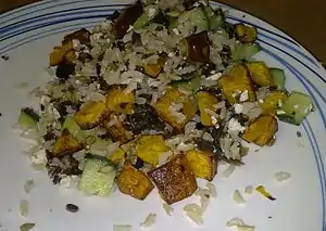 Recipe published by http://www.Monkeylicious.net under a Creative Commons Attribution-ShareAlike 2.5 License, retrieved 2010-05-17 from http://www.monkeylicious.net/recipes/Roast_Butternut__Biltong_and_Brown_Rice_Salad. Monkeylicious.net has given permission for it to be reprinted here under the wikibooks license (permission obtained 2010-05-17, by email, cswreeve).