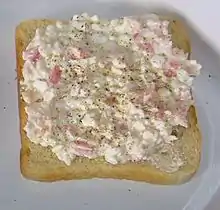 - Mix 1 dl mayonnaise with 1 dl sour cream in a cup or bowl, place in the refrigerator. Mix the remaining mayonnaise and cottage cheese in another bowl together with the chopped shrimp; this is the filling. Cut the bread lengthwise to make eight 1 cm thick slices. Do not use the top and bottom slice. Place two slices next to each other, preferably on a cutting board. Spread one third of the filling on top of the bread slices. Add two more bread slices on top. Spread half of the remaining filling and repeat for the final layer. The cake should now have four layers of bread with three layers of filling between them.
