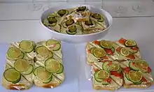 When preparing the sandwich cake in "appetizer style" do not cut the bread lengthwise, instead cut normal slices. It is also possible to use pre-sliced bread. Only use two layers for the appetizers and use a tooth-pick to hold it together.