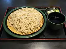 Soba are Japanese thin buckwheat noodles. They can be served hot, as a soup (kake-soba), or cold, with a dipping sauce (zaru-soba).