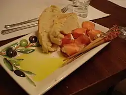I welcomed my guests with an aperitif of their choice: a Bellini or an Aperol Spritz. With the aperitif I served mouth-watering appetizers: Greek feta cheese wrapped in cold ham or beef served with home-made white bread and extra virgin olive oil. It tastes fabulous and at the same time it is easy to prepare. The only thing you have to do yourself, besides wrapping the ham around the cheese, is to bake the home-made bread: