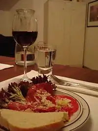Again, a teeny tiny effort with a tremendous effect. Make sure you buy good quality carpaccio. You need about two or three slices of it per person. Put the carpaccio on the chicory leaves. You can use any other kind of lettuce if you find chicory too bitter. Grate Parmesan over it and sprinkle some olive oil on top. Now sprinkle the herbs over the top and decorate the plate with two grissini. While you are busy preparing the food, do not forget to keep the drinks coming. Red wine goes very well with the first course.
