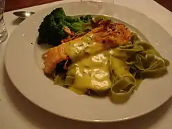 Salmon fillet on green ribbon noodles with lemon-chives-sauce and florets of broccoli