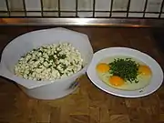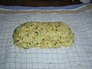 Form the dough into a roll, wrap it into a wet dishtowel, and firmly tie up both ends. Then put it into a pot of boiling saltwater and let it simmer for about 30 minutes. Remove the dough from the dishtowel, cut it into generous slices, and arrange them nicely on the plate.
