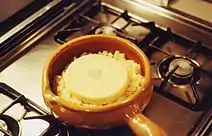 - Lightly butter the inside of an 10- or 11-inch earthenware baking dish. Add the potato mixture and smooth the surface.