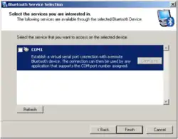 The opened window (on a figure too) enables you to choose which service you want to use. Select COM1 (add a tick). If there isn't any service, it's maybe because the battery is too low. This action opens a new window (see the next figure). Here you can select which port is used for the communication. Select for example ”COM6”.