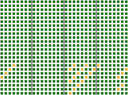 The avalanche behavior of this hash shown on the right. The image was made using Bret Mulvey's AvalancheTest in his Hash.cs toolset. Each row corresponds to a single bit in the input, and each column to a bit in the output. A green square indicates good mixing behavior, a yellow square weak mixing behavior, and red would indicate no mixing. Only a few bits in the last byte are weakly mixed, a performance vastly better than a number of widely used hash functions.