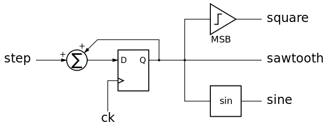 - Considering the sawtooth output as a phase signal allows to calculate trigonometric functions and delivering a sine or even quadrature sine and cosine outputs