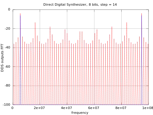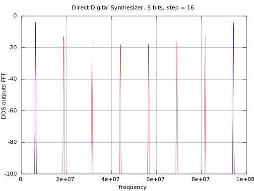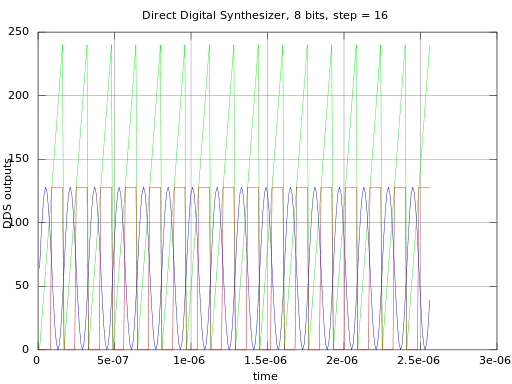 The preceeding figures have been made with a nice step value: 16. When the step value doesn't exactly divide the counter range, the teeth of the sawtooth are more ragged and the square wave output shows a kind of jitter: its mean frequency is the desired one but the signal edges are shifted to the closest active clock edge.