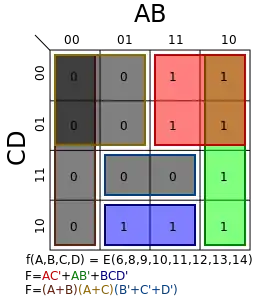K-maps can only be created if a truth table is present; it works differently for sequential logic, which will be discussed later. A finished K-map can make a truth table, or a boolean equation vice versa. Once a truth table is acquired, a Karnaugh map can be created. The top left corner(or sometimes just the top and the left) of a K-map shows the variables used for that side.The picture of the K-map example shows the variables associated to that side. The top is A and B and the numbers below them is the state A and B are for that column (i.e. The column 10 is when A is true(high) and B is false(low)). From the truth table we put its output in the corresponding squares (i.e. If on the truth table when ABCD is 1011 and the output was 1, then on the four variable map, a 1 would go in the fourth column, second row). The following example shows how to translate a truth table to a K-map and then turn the K-map into a boolean equation.