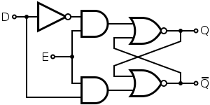 The D latch (D for "data") or transparent latch is a simple extension of the gated SR latch that removes the possibility of invalid input states.