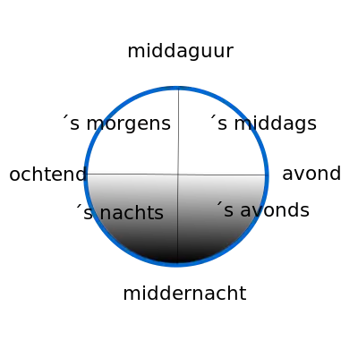 In Dutch, rather than using am/pm, the 24 hours of a day are roughly divided in four 6 hour periods with four adverbial expressions. Click on the arrows to hear the pronunciation.