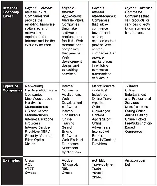 The CREC (Center for Research in Electronic Commerce) at the University of Texas has developed a conceptual framework for how the Internet economy works. The framework shows four layers of the Internet economy-the three mentioned above and a fourth called intermediaries (see Table 1).