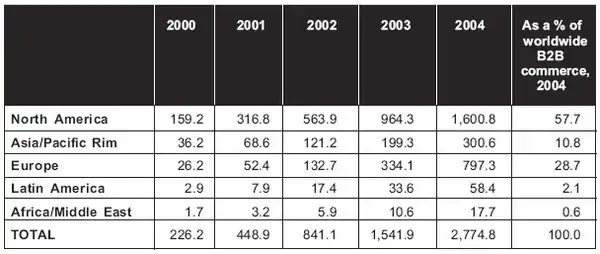 Table 2 shows the projected size of B2B e-commerce by region for the years 2000-2004.