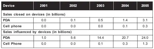 Forrester Research predicts US$3.4 billion sales closed using PDA and cell phones by 2005 (See Table 3).